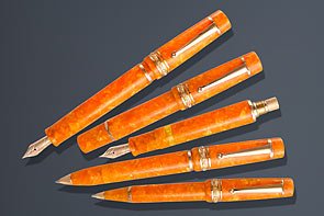 The brilliant, lush pearlized orange that has been the trademark color of the Dolcevita pen body now takes over the cap, for full-on glow of Mediterranean sun from top to bottom. Each pen of fine resin is hand turned by Italian artisans in Naples. The central ring is hand-engraved sterling silver in a Pompeian motif, and the clip features a wheel for smooth pocket clipping; both are coated in gold for an elegant finish. Select from 3 fountain pen styles: a medium-sized piston filler with control knob to draw ink from a bottle and a transparent reservoir for checking your ink level, a medium-sized cartridge fill, and a commanding oversize. Each poses a smooth 14k gold nib. Ballpoint and rollerball modes also available. Nib Material: 14K. MANUFACTURERS WILL ONLY HONOR WARRANTIES ON PRODUCTS PURCHASED FROM AN AUTHORIZED DEALER. DON'T GET BURNED, BUY AUTHORIZED.